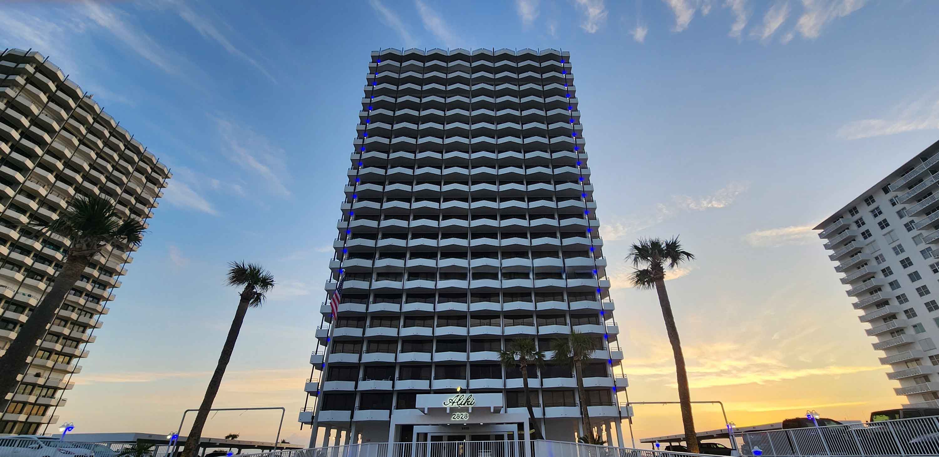 The Aliki Condominium is a lovely 20-story oceanfront building located on the world-famous Daytona Beach. For over 50 years, the residents have enjoyed breathtaking views of the Atlantic Ocean to the east and dramatic sunsets over the Halifax River to the west.
